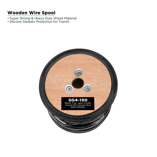 Recoil Audio - SG4-150 - TRUE-SPEC 4AWG TINED OFC SHINY BLACK PVC GROUND WIRE, 150FT/WOODEN SPOOL
