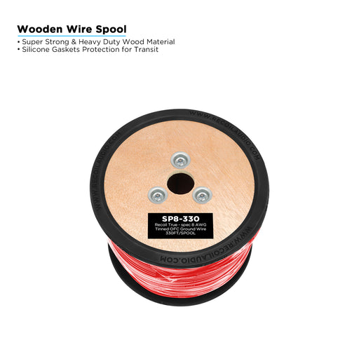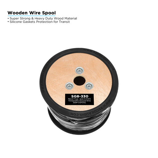 Recoil Audio - SG8-330 - TRUE-SPEC 8AWG TINED OFC SHINY BLACK PVC POWER WIRE, 330FT/WOODEN SPOOL